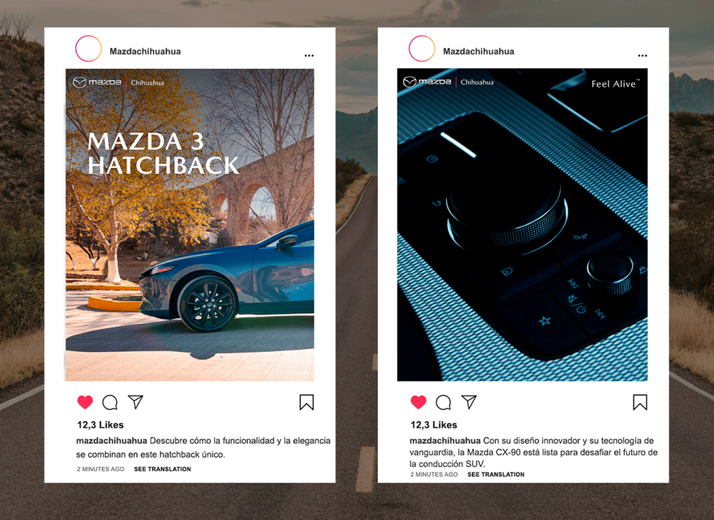 En Mazda Chihuahua y Mazda Juárez desarrollamos contenido semanal estratégico enfocado en cada uno de nuestros modelos, destacando sus principales características, especificaciones técnicas, desempeño, diseño y tecnología. Asimismo, integramos mes a mes fechas relevantes en nuestras portadas, donde siempre se presenta como protagonista uno de los vehículos de la familia Mazda.